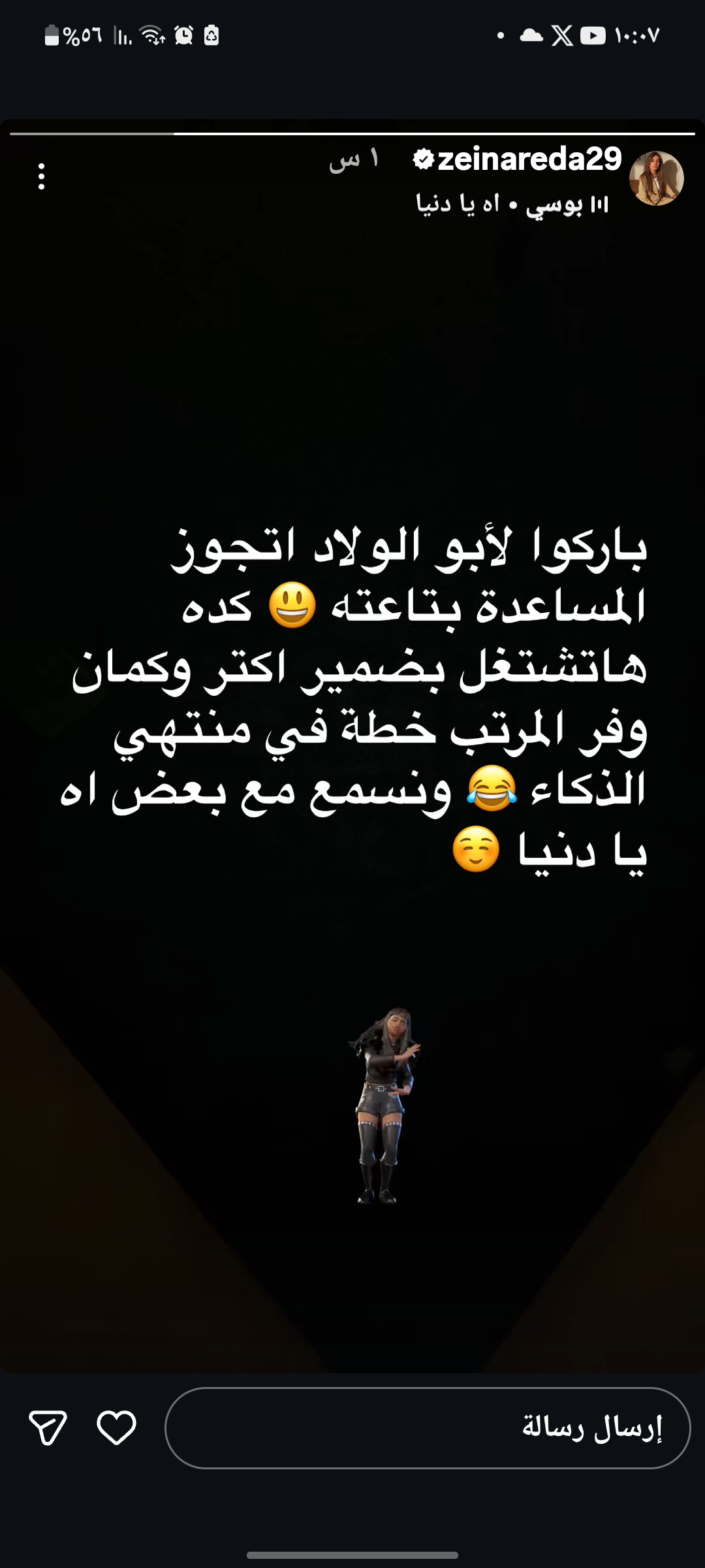 ونشرت زينة تعليقها من خلال خاصية «ستوري» على حسابها الرسمي بموقع تبادل الصور والفيديوهات إنستجرام، حيث قالت نصًا: «باركوا لأبو الولاد اتجوز المساعدة بتاعته.. كده هاتشتغل بضمير أكتر وكمان وفر المرتب، خطة في منتهي الذكاء ونسمع مع بعض آه يا دنيا».