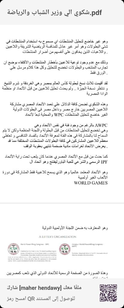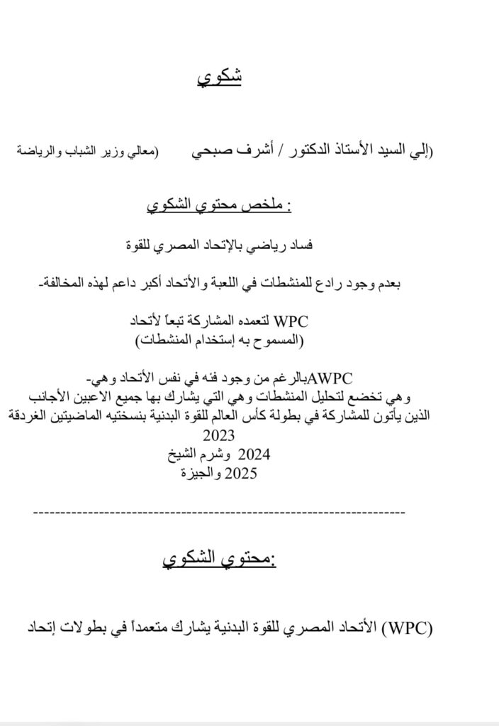 وأكد اللاعبون في مذكرتهم أن الاتحاد تعمّد المشاركة في بطولات تخالف المواثيق الدولية ولا تضمن مبدأ العدالة بين اللاعبين، من بينها ثلاث بطولات لكأس العالم أُقيمت في الغردقة 2023، وشرم الشيخ 2024، والجيزة 2025، تحت مظلة اتحاد وهمي يُدعى WPC، يسمح بتعاطي المنشطات ولا يُجري أي تحاليل للكشف عنها.