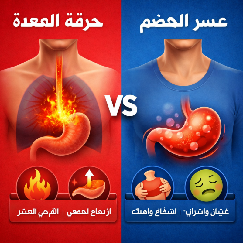 | السبب الرئيسي | ارتجاع الحمض | أسباب متعددة (أكل زائد – دهون – توتر) |
