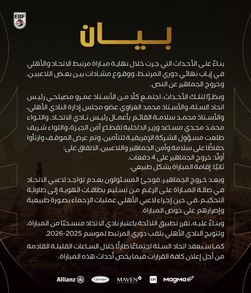 بيان اتحاد السلة أوضح أن الأزمة بدأت بعد نهاية مباراة المرتبط تحت 18 عامًا، والتي شهدت اشتباكات ومشادات حادة داخل الصالة، عقب قيام أحد لاعبي الاتحاد بقذف الكرة تجاه لاعبي الأهلي أثناء الاحتفال، مما تسبب في حالة توتر كبيرة وخروج الأجواء عن السيطرة.