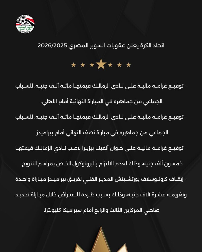 أعلنت لجنة المسابقات بالاتحاد المصري لكرة القدم عقوبات بطولة كأس السوبر المصري 2025/2026، والتي جاءت كالتالي:
