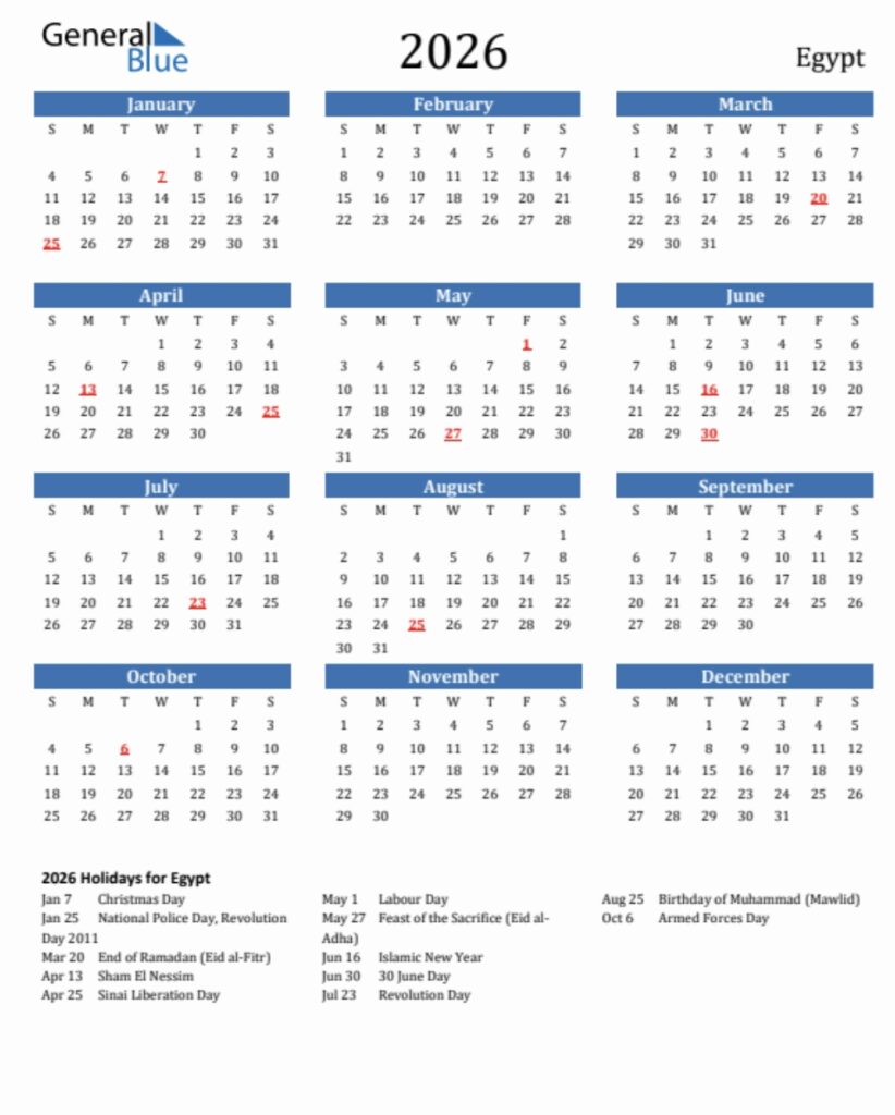 تشمل الإجازات الرسمية في مصر خلال عام 2026 مزيجًا من المناسبات الدينية الإسلامية، والأعياد القومية، والمناسبات الوطنية المرتبطة بتاريخ الدولة المصرية، والتي يحصل خلالها العاملون بالدولة على عطلة رسمية مدفوعة الأجر وفقًا لقرارات مجلس الوزراء.