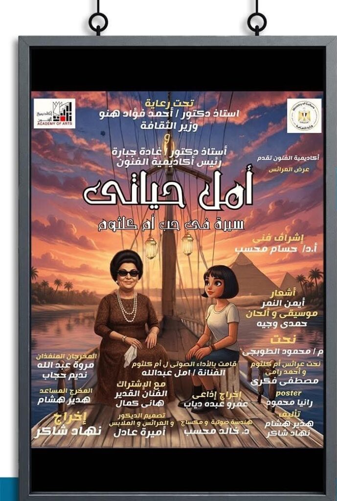 يعرض مسرح أكاديمية الفنون بمنطقة الهرم، في محافظة الجيزة، اليوم الأحد 30 نوفمبر الجاري، العرض المسرحي “أمل حياتي.. سيرة في حب أم كلثوم” إخراج نهاد شاكر، وتحت رعاية وزير الثقافة الدكتور أحمد فؤاد هنو ورئيس الأكاديمية الدكتورة غادة جبارة.
