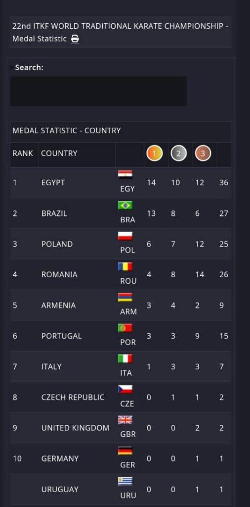 وحصد منتخب مصر للكاراتيه التقليدي لقب البطولة بعدما تصدر جدول ترتيب الميداليات برصيد 36 ميدالية متنوعة بواقع 14 ميدالية ذهبية و 10 ميداليات فضية و 12 ميدالية برونزية متفوقا على أقرب منافسية منتخب البرازيل صاحب المركز الثاني برصيد 27 ميدالية؛ بينما احتل منتخب بولندا المركز الثالث في جدول الترتيب برصيد 25 ميدالية متنوعة.