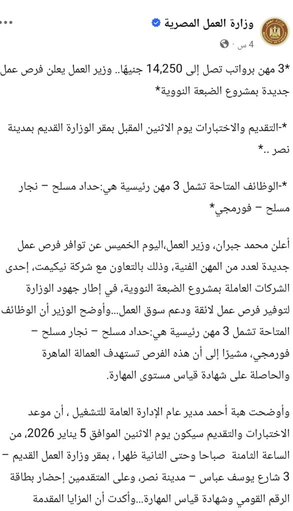 أعلنت وزارة العمل المصرية اليوم الخميس عن توافر فرص عمل جديدة لعدد من المهن الفنية بالتعاون مع شركة “نيكيمت”، إحدى الشركات العاملة بمشروع الضبعة النووي، ضمن جهود الدولة لتوفير وظائف لائقة ودعم سوق العمل.