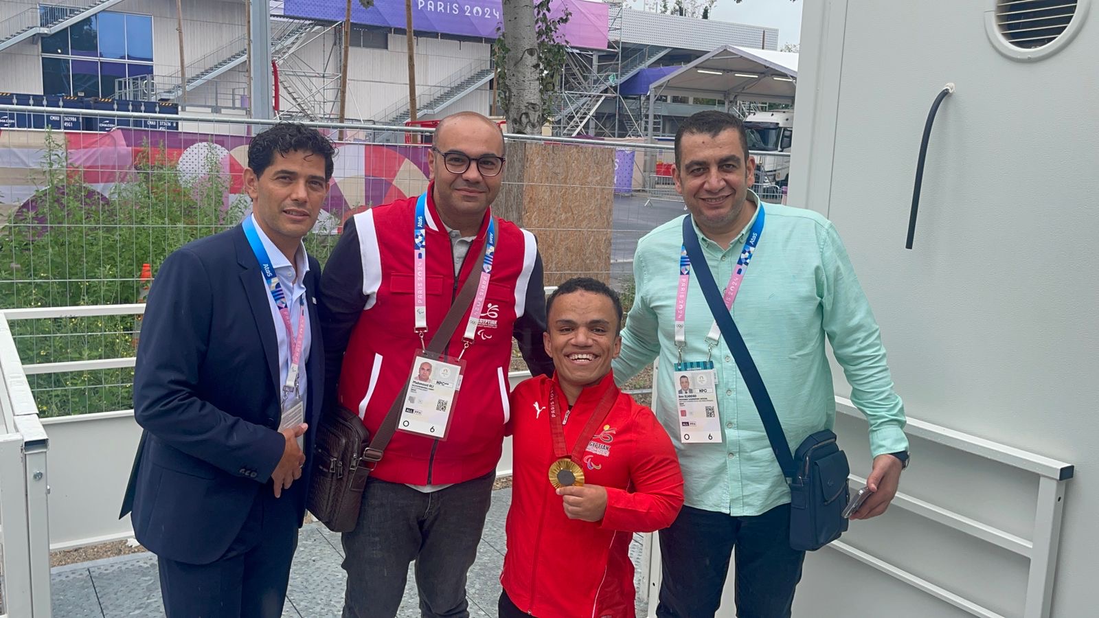 برفقة ممثل وزارة الشباب والرياضة ورئيس لجنة الاتحاد الدولي لرفع الأثقال البارالمبية، تم التقاط صور تذكارية مع بطل مصر محمد المنياوي الذي أحرز الميدالية الذهبية.