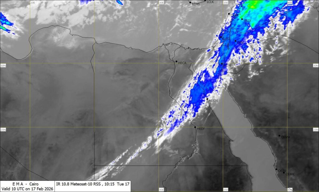 وأظهرت أحدث صور الأقمار الصناعية تحرك الغطاء السحابي تدريجيًا في اتجاه شرق البلاد، خاصة نحو شبه جزيرة سيناء ومحافظة البحر الأحمر، بالتزامن مع استمرار تأثير الرياح النشطة المثيرة للرمال.