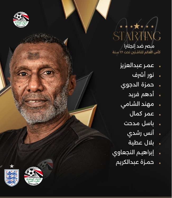 أعلن أحمد الكاس المدير الفني لمنتخب مصر للناشئين تحت 17 عاما، تشكيلة الفريق التي يبدأ بها مواجهة منتخب إنجلترا في الجولة الختامية بدور المجموعات، لحساب المجموعة الخامسة في كأس العالم للناشئين، المقامة حاليا في الإمارات وتختتم فعالياتها يوم 27 نوفمبر الجاري.