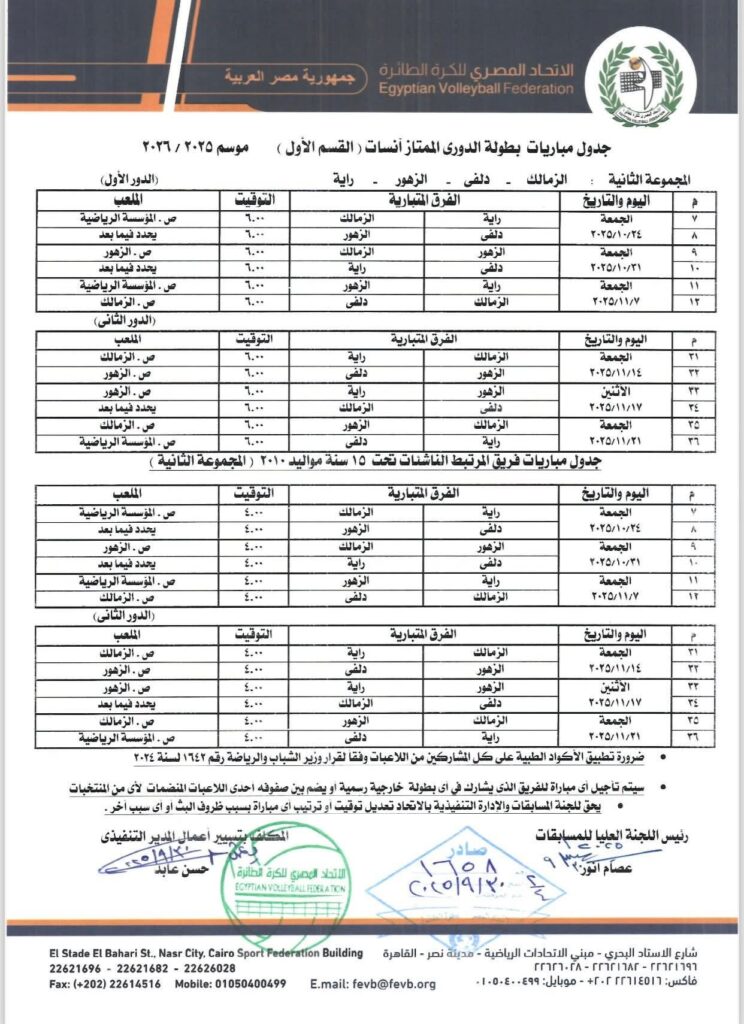 كشف الاتحاد المصري للكرة الطائرة عن جدول مباريات بطولة الدوري الممتاز (أ) سيدات موسم 2025-2026، حيث جاء فريق الزمالك في المجموعة الثانية بجوار فرق دلفي، الزهور، وراية.