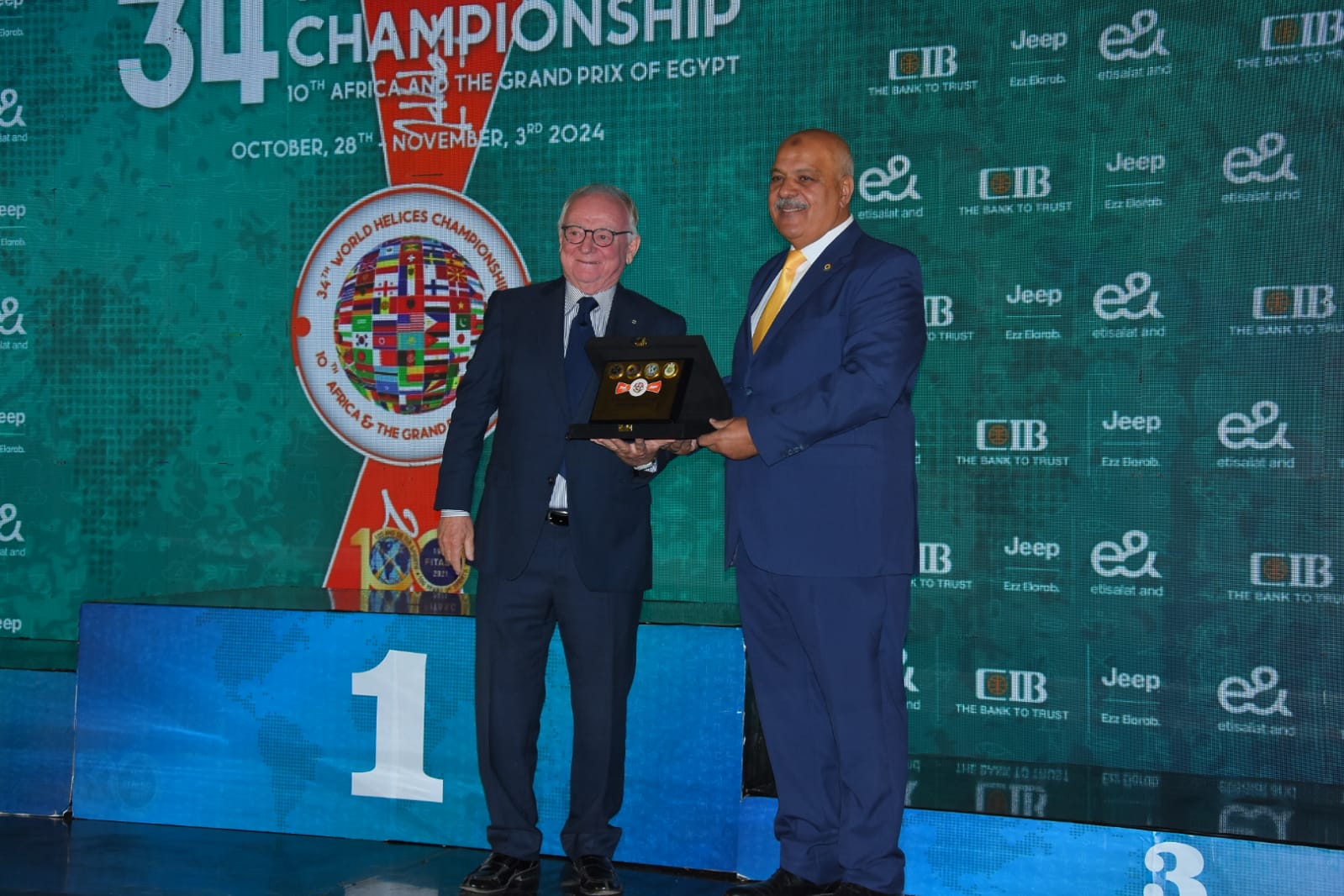 وقام جون فرانسوا، رئيس الاتحاد الدولي للرماية على الأطباق المروحية FITASC، وبيرو دوناتو السكرتير العام ونائب رئيس الاتحاد الدولي للرماية، بمنح اللواء حازم حسني رئيس الاتحادين الأفريقي والمصري وسام الميدالية الذهبية.