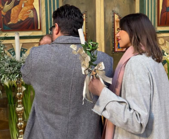 وظهر ناصيف زيتون وهو يحمل الطفل بين يديه، بينما حرصت دانييلا رحمة على عدم إظهار ملامح وجهه بشكل واضح.