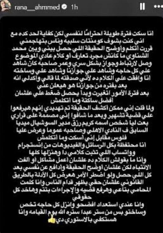 وقالت رنا أحمد عبر خاصية «الاستوري» على موقع إنستجرام إن العلاقة بينهما لم تكن مجرد معرفة عابرة، بل وصلت – بحسب قولها – إلى زواج سري، مؤكدة أنها تمتلك رسائل ومقاطع فيديو قالت إنها تثبت صحة روايتها.