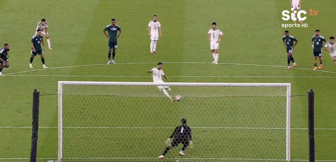 حصل محاربو الصحراء على ركلة جزاء بعد تدخل داخل منطقة الجزاء، تقدم لها النجم رياض محرز وسددها بثبات على يمين الحارس نواف العقيدي، ليمنح الجزائر التقدم.
