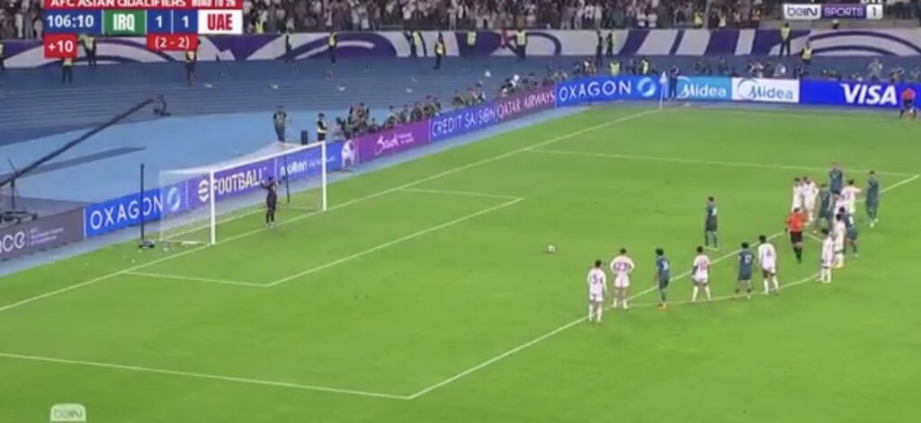 وفي الوقت الذي كانت فيه المباراة تتجه نحو التعادل، احتسب الحكم ركلة جزاء مثيرة للجدل في الدقيقة 103 بعد لمسة يد على اللاعب الإماراتي يحيى نادر وسط اعتراضات كبيرة.