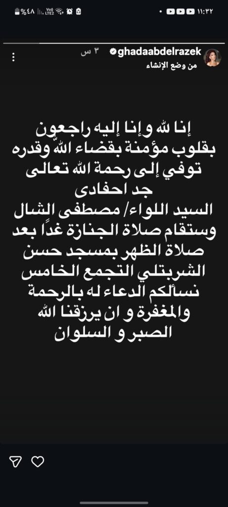 ونشرت الفنانة غادة عبد الرازق رسالة نعي عبر خاصية «ستوري» على حسابها الرسمي بموقع إنستجرام، قالت فيها: «إنا لله وإنا إليه راجعون.. بقلوب مؤمنة بقضاء الله وقدره.. توفي إلى رحمة الله السيد اللواء مصطفى الشال، جد أحفادي».