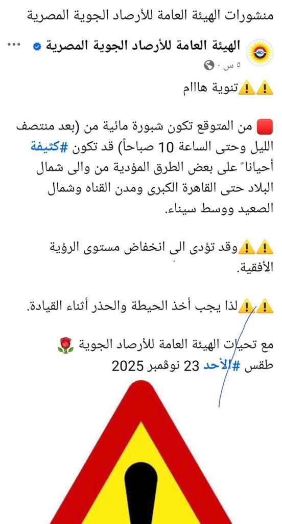 أوضحت الأرصاد أن سبب الشبورة يعود لارتفاع نسب الرطوبة مع هدوء الرياح، ما يسمح بتكوّن طبقات ضبابية كثيفة، خاصة في المناطق القريبة من المسطحات الزراعية. وأكدت أن الشبورة تستمر خلال هذا الأسبوع على فترات متقطعة بين الفجر والصباح.
