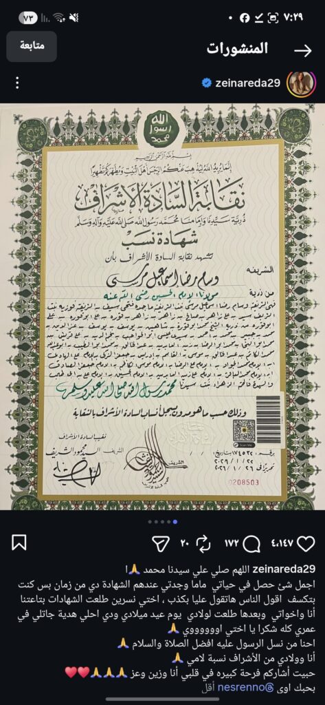 وكتبت زينة في منشورها: «أختي نسرين طلعت الشهادات بتاعتنا أنا وأخواتي وبعدها طلعت لولادي يوم عيد ميلادي ودي أحلى هدية جتلي في عمري، إحنا من نسل الرسول عليه أفضل الصلاة والسلام أنا وأولادي من الأشراف نسبة لأمي».