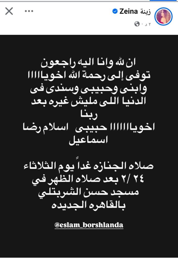 وجاء إعلان الوفاة عبر شقيقه حمادة رضا، الذي كتب عبر حسابه الشخصي على موقع فيسبوك: “إنا لله وإنا إليه راجعون.. توفى إلى رحمة الله أخويا وابني اللي مليش غيره بعد ربنا”، في رسالة مؤثرة عكست حجم الصدمة التي تعيشها الأسرة.